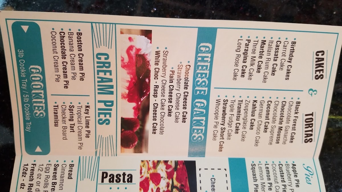 - Pies: Traditional pie options such as banana cream, Boston cream, fruit pies, coconut custard, apple, blueberry, lemon meringue, ricotta, and bread puddings with variations like dulce de leche.